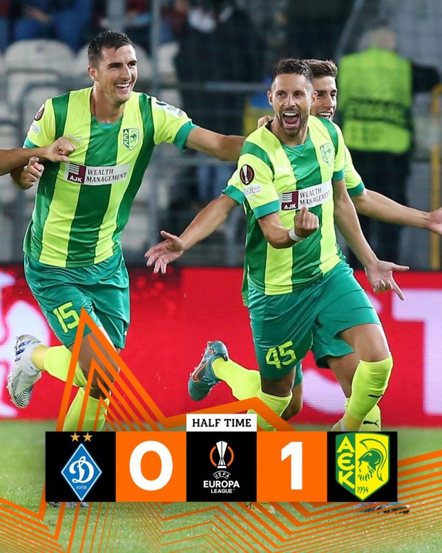 O Larnarka, do Chipre, abriu o placar ainda aos oito minutos do primeiro tempo e administrou o placar contra o Dínamo Kiev, da Ucrânia. Com o placar, a equipe do Chipre marca os primeiros tempos, mas segue em 3º lugar. Os ucranianos ainda não pontuaram e permanecem na lanterna do Grupo B- Foto: @AEKLarnaca/Reprodução/ND - 13 de 15