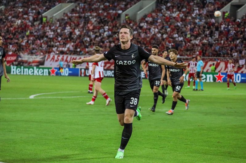 O torcedor do Olympiacos, da Grécia, que estava feliz com a chegada de James Rodrigues logo levou um grande golpe. O Freiburg, da Alemanha, venceu por 3 a 0 na casa dos gregos – Foto: @scfreiburg/Reprodução/ND - 3 de 15
