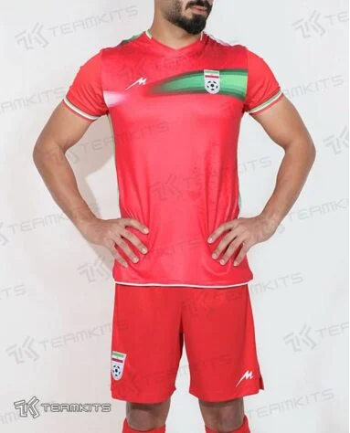 Uniforme 2 do Irã para o Mundial do Catar tem predominância em vermelho, além de tons em branco e verde – Foto: Teamkits/Reprodução
