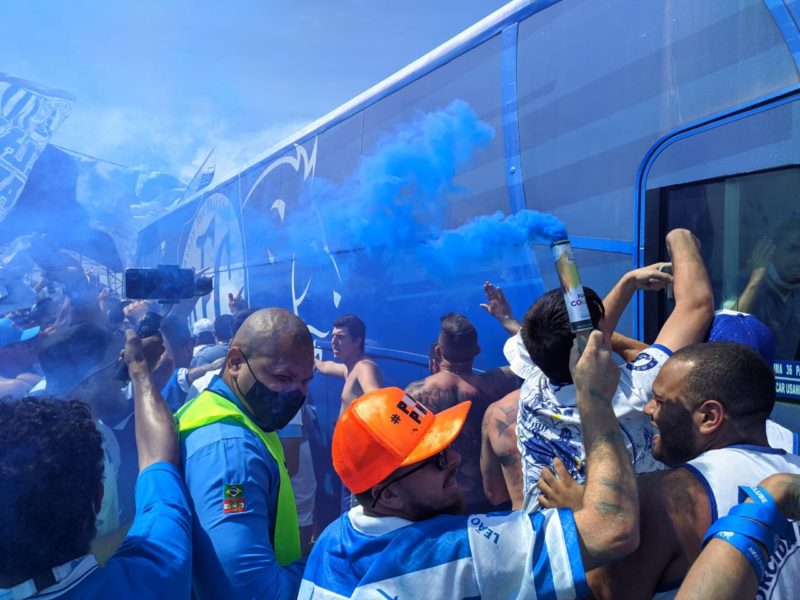 Chegada do ônibus teve sinalizadores, bandeirões e muita festa da torcida – Foto: Ian Sell/ND - 7 de 19