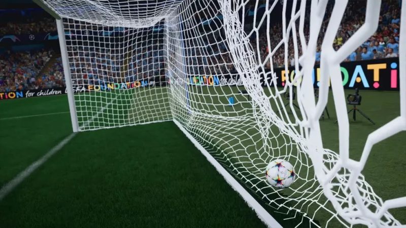 Outro detalhe interessante é a diferença na ambientação em relação ao FIFA 22. A grama terá mais marcas de carrinho, chutes e bolas divididas. Além disso, rede ganhou uma geometria 3D completa para reagir de acordo com a física ao impacto da bola – Foto: EA Sports/Reprodução/ND