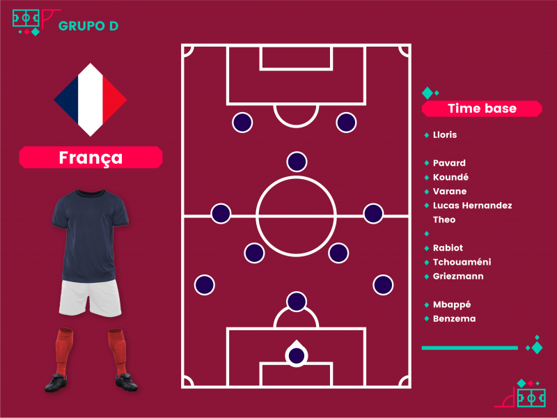 Embora seja uma das grandes favoritas ao título, a França chega “baleada” ao Catar com o desfalque de ao menos seis jogadores machucados, especialmente em seu meio-campo que não terá Pogba e Kante. Maignan, Kamara, Christopher Nkunku e Kimpembe também estão fora.