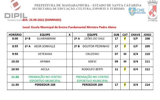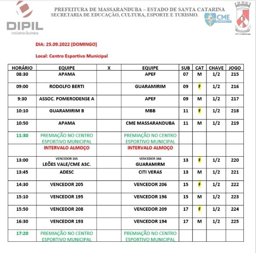 No domingo (25), a partir das 8h, acontecem os jogos decisivos de todas as categorias no masculino e feminino. Além disso, acontecem as premiações da competição.