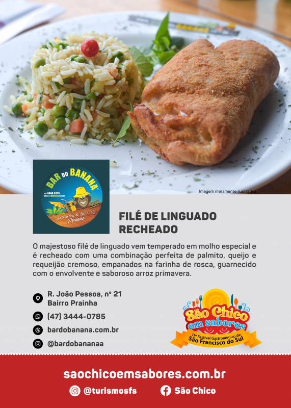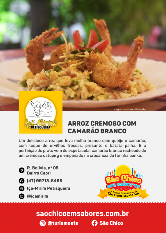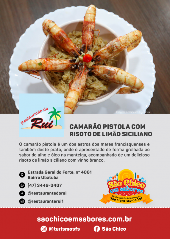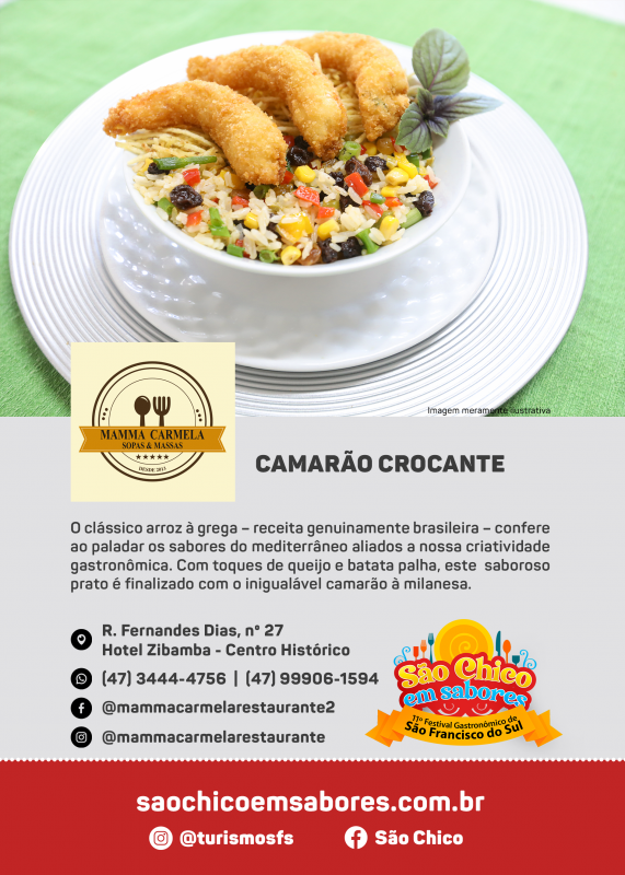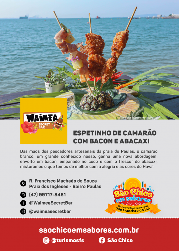 Não faltam opções deliciosas: de camarão à sanduíche. Isto é o que promete o 11º Festival Gastronômico São Chico em Sabores, que acontece entre 12 e 14 de agosto no Casarão Calixto, no bairro do Paulas, em São Francisco do Sul, Norte de Santa Catarina.