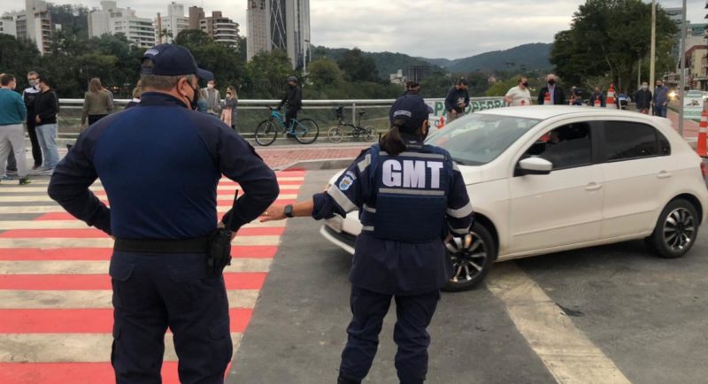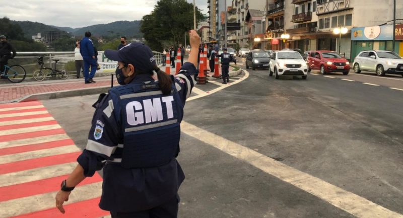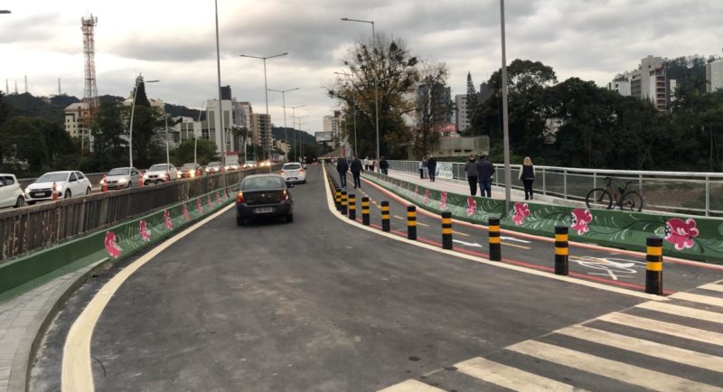 Neste período, a estrutura ficará com uma pista de acesso ao bairro Ponta Aguda e uma pista de acesso ao Centro, além dos passeios e da ciclofaixa. – Foto: Gabriela Milanezi/NDTV Blumenau - 7 de 8