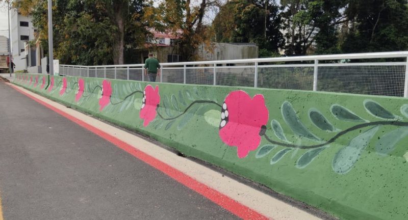Para dar vida à duplicação da ponte Adolfo Konder, a Secretaria de Cultura e Relações Institucionais, em parceria com a artista blumenauense Sandra Bugmann, registrou na ponte a tradicional arte Bauernmalerei. Originária dos Alpes europeus, a arte, cujo nome vem de Bauer, algo como agricultor, e maler, pintor, pode ser traduzida livremente como pintura camponesa. – Foto: Stêvão Limana/NDTV Blumenau - 8 de 8