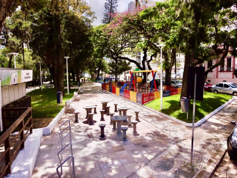 Também serão entregues diversas áreas de lazer pelo programa Praça Viva. São as Praças: Olívio Amorim, no Centro; a Caiçara, no Itacorubi; a Quero-Quero, na Daniela; e as áreas de lazer de esporte do Rio Tavares, em parceria com o Supermercado Hiperbom, adotante; e da Barra da Lagoa, próximo ao projeto Tamar. Na imagem: Praça Olívio Amorim, Centro, que foi revitalizada e será entregue simbolicamente no aniversário da cidade. – Foto: PMF/Divulgação - 4 de 7