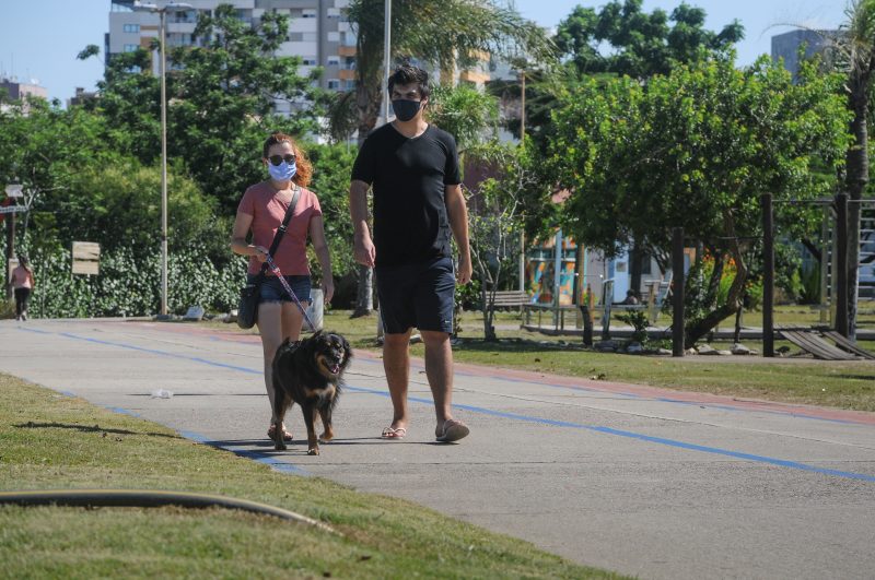 Julia Poletto e Lucca Trilha aproveitaram a tarde de sol na Capital para passear com o cachorro. Moradora do bairro de Coqueiros, a jovem de 26 anos aprovou a manutenção do parque. “Tava horrível, o mato muito alto, cheio de erva daninha, não dava pra trazer o cachorro porque ele voltava cheio de ‘pega-pegas’. Agora ficou bem melhor” – Foto: Leo Munhoz/ND