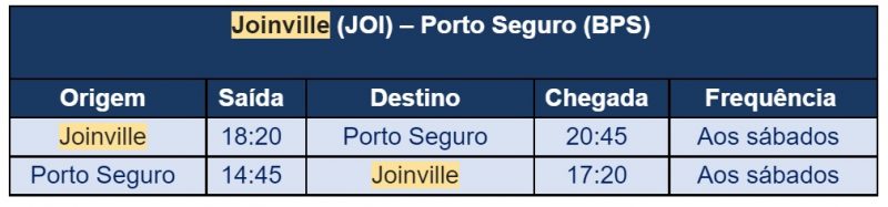 De Joinville, os voos partirão às 18h20, com chegada prevista em Porto Seguro às 20h45. No sentido contrário, as viagens terão início às 14h45 e pouso previsto para às 17h20.