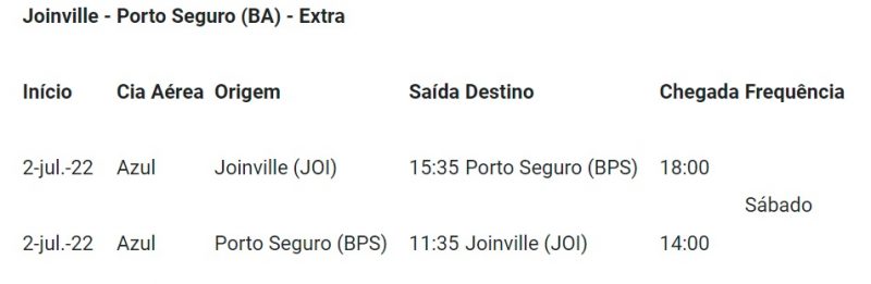 “Os voos diretos Joinville-Porto Seguro foram programados para atender a alta temporada do mês de julho. Após o período, os voos voltarão a operar de maneira regular. A operação continua, mas em voos com escala”, respondeu a Azul.