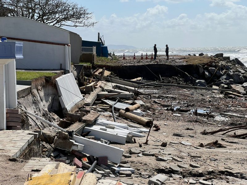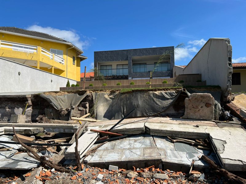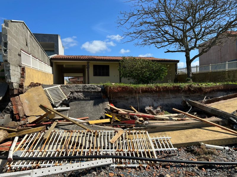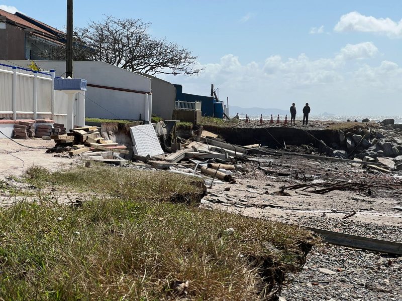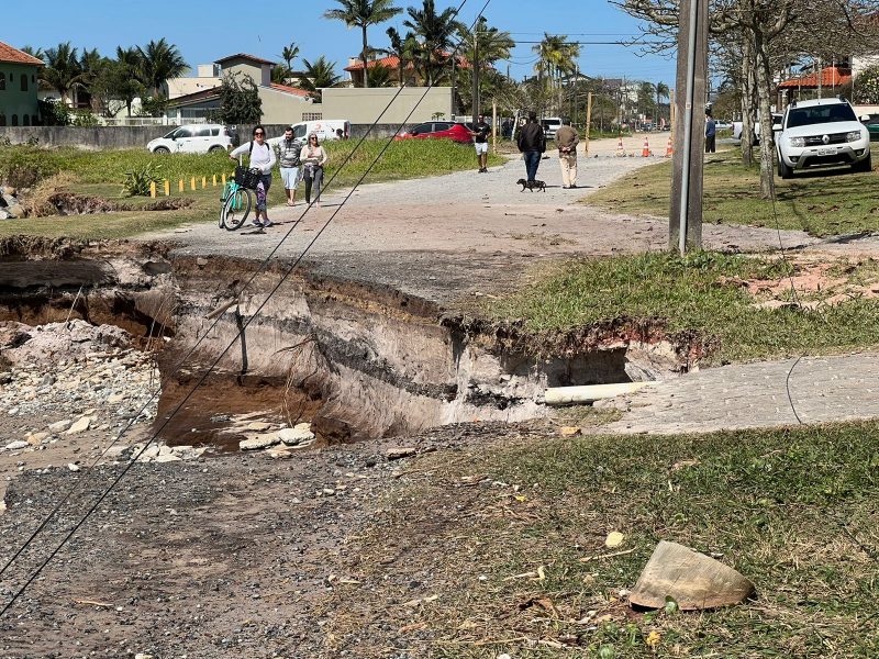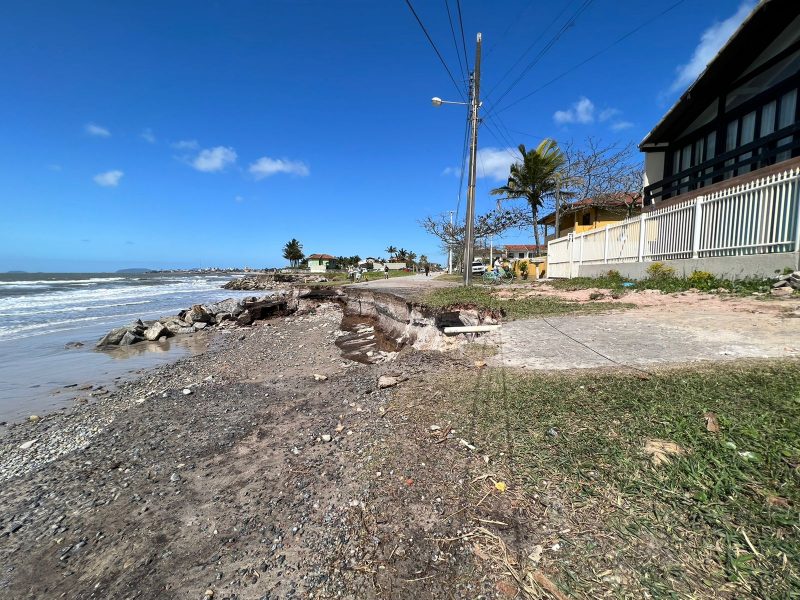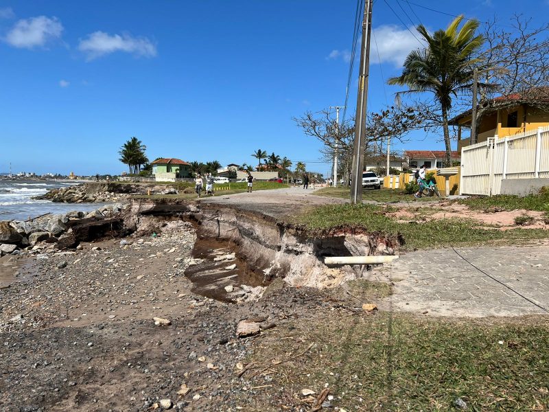 No final de semana, a erosão na rua do Príncipe, no Balneário Cambiju, destruiu completamente a via, danificando postes de energia e a rede de água, além de ter causado estragos em oito imóveis. Moradores das casas atingidas precisaram deixar as residências.