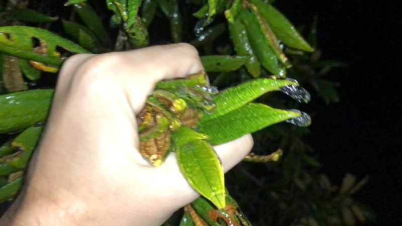 Um engenheiro ambiental registrou chuva congelada no alto da Serra Smith entre a noite de segunda-feira (28) e madrugada de terça-feira (29). As fotos e vídeos foram feitos por Diego Soares, no limite entre Campo Alegre e Joinville. Segundo ele, o cume tem altitude de 1,2 mil metros – Foto: Diego Soares - 3 de 10