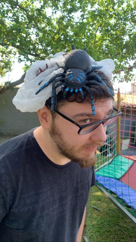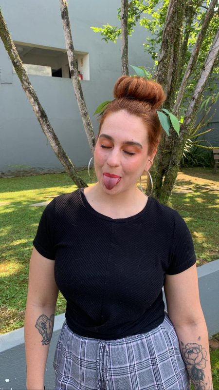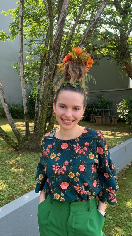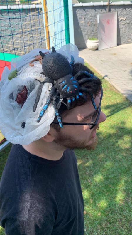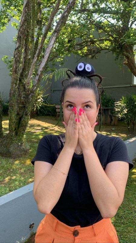 Ela, que é ruiva, aproveitou a cor do cabelo mais alaranjado e se transformou em uma abóbora. Um coque e folhas ao redor do cabelo já trouxeram o ar diferentão da brincadeira. Outros colegas também brincaram, transformaram a cabeça em uma aranha, em potes de pipoca, teias de animais peçonhentos e por aí foi.