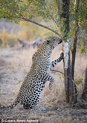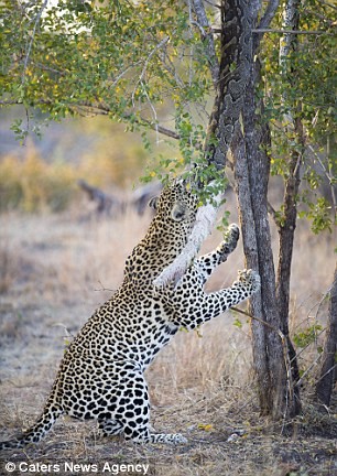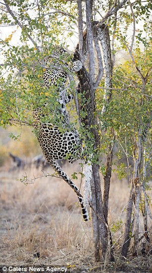 Repentinamente, a onça agarra a píton com suas garrafas violentas e arrasta serpente para baixo da árvore, espalhando folhas e galhos para todas as direções. – Foto: Caters News Agency/ND - 4 de 6