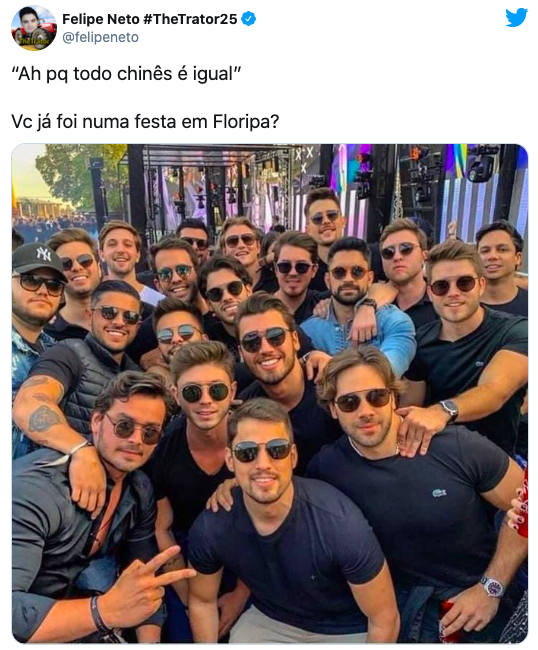 O youtuber Felipe Neto fez uma piada que dividiu opiniões entre quem achou graça e quem não gostou. Em outubro, ele publicou uma foto que mostra vários homens vestidos de modo parecido – camisas escuras e óculos de sol. E escreveu “Ah porque todo chinês é igual’ – Você já foi numa festa em Floripa?”. Ele atribuiu a imagem a uma festa em Florianópolis, embora o registro seja de Campo Grande, capital do Mato Grosso do Sul. O post tem mais de 120 mil curtidas. Foto: Reprodução/Twitter/ND - 2 de 8