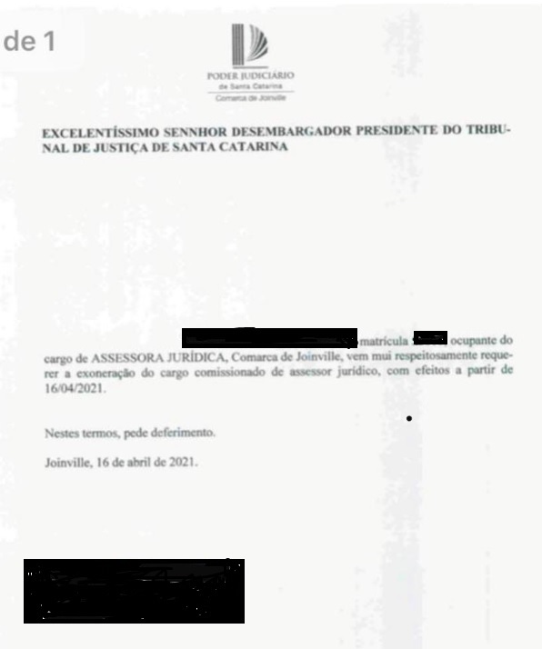 A assessora jurídica que teve uma conversa vazada com o juiz da 1ª Vara da Família da Comarca de Joinville, Gustavo Schwingel, pediu exoneração do cargo ainda na sexta-feira (16).