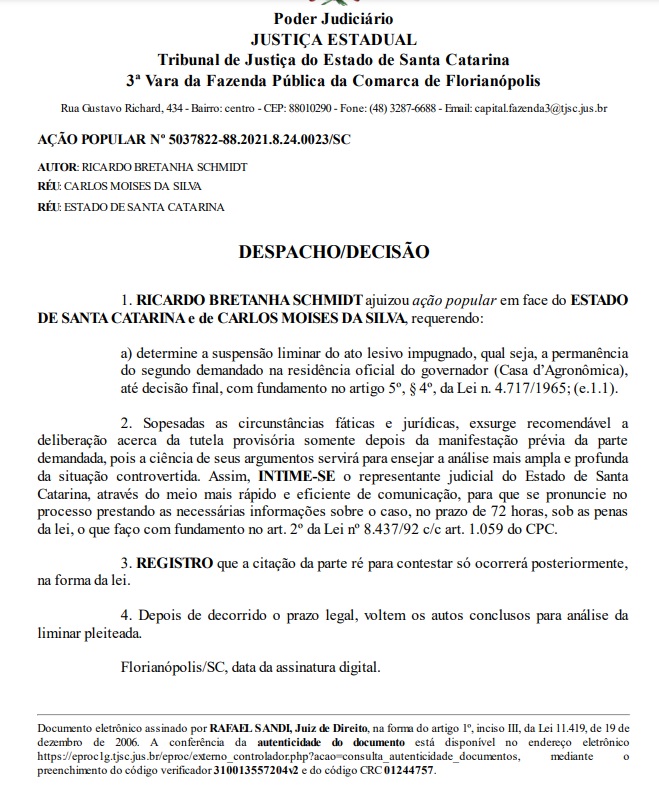 SeguirNesta terça-feira (27), o juiz Rafael Sandi determinou que o representante judicial do Estado de Santa Catarina se pronuncie no processo prestando as necessárias informações sobre o caso no prazo de 72 horas. Somente após os argumentos do procurador-geral do Estado o magistrado irá analisar de forma mais ampla e profunda da situação.