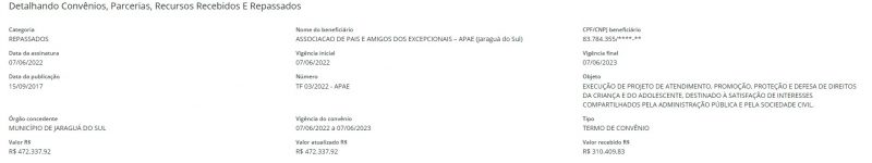 As entidades recebem repasses do município de Jaraguá do Sul, conforme consulta Portal da Transparência do Município. A APAE, cuja vigência do convênio vai de 07/06/2022 a 07/06/2023, recebe R$ 472.337,92. Já a AMA, cujo convênio vai de 25/01/2022 a 25/01/2023, R$ 100.489,85.