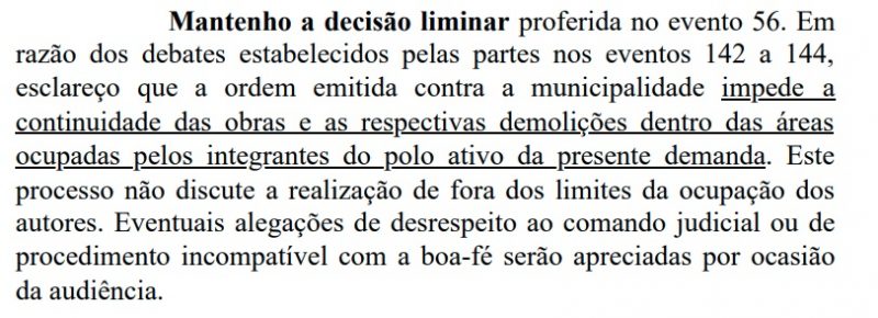 Ou seja, todas as ações de derrubadas e obras do Parque Linear dentro da área de conflito onde estão os 21 donos de imóveis continuam suspensas provisoriamente.