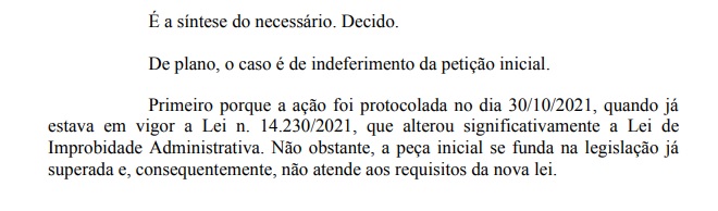 Ocorre que houve a promulgação de uma nova lei sobre improbidade administrativa (lei 14.230/2021), a qual alterou a lei anterior n. 8.429/1992. Na primeira ação, que tratava exatamente da mesma questão, a juíza Marilene Granemann de Mello indeferiu, como mostra abaixo.