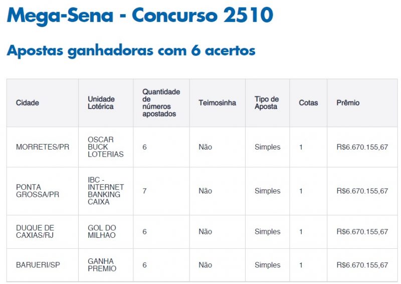 Um dos jogos, feito em Mafra, no Planalto Norte catarinense, foi de sete números. Por conta disso, o vencedor levou a bolada de R$ 29.636,36. Já os outros apostadores, que fizeram o jogo tradicional de seis números, faturaram R$ 14.818,18 cada. Todas as apostas foram simples, contemplando apenas uma pessoa.