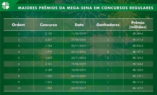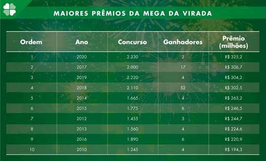 - Criada em 2009, a Mega da Virada foi o primeiro concurso especial das Loterias Caixa. O concurso de final de ano foi inspirado na cultura de prêmios multimilionários de tradicionais loterias do mundo, como por exemplo o grande prêmio El Gordo de Navidad, da Espanha. No Brasil, em 12 anos o concurso especial já pagou na faixa principal R$ 2,9 bilhões para 109 ganhadores de 20 estados diferentes.