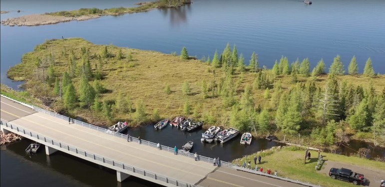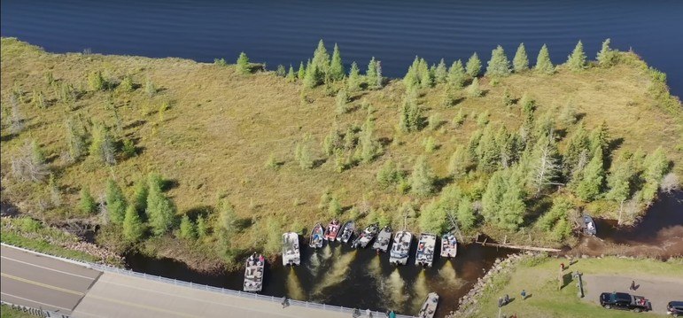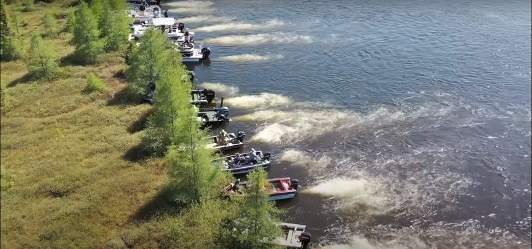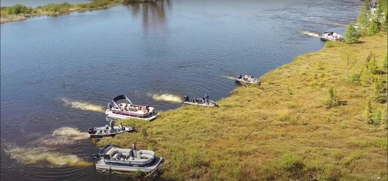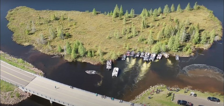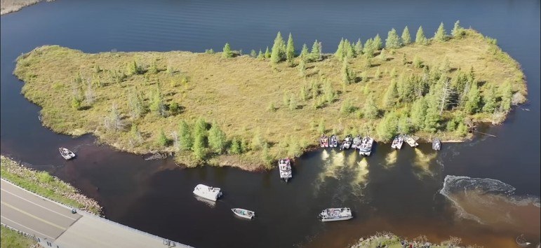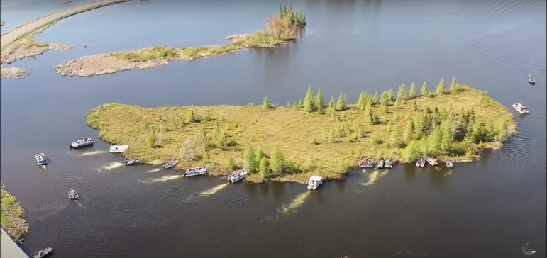 Uma grande ilha flutuante no lago Chippewa, nos Estados Unidos, precisa ser empurrada por vários barcos para não bloquear uma ponte importante. A ação precisa ser feita quase todos os anos, já que ela se move o suficiente para causar transtornos. – Foto: AirFox Photography/Youtube/Reprodução ND - 2 de 8