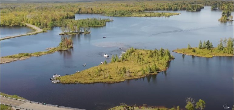 O lago onde a ilha está localizada foi criado no ano de 1923, após uma série de empreendidos inundarem um grande pântano em Wisconsin. – Foto: AirFox Photography/Youtube/Reprodução ND - 4 de 8