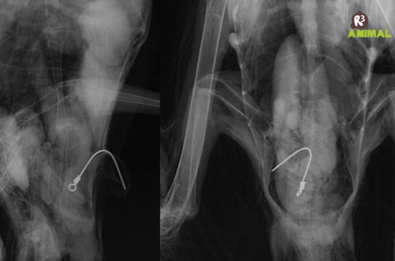 O objeto, um encastoador de pesca, usado em anzóis, perfurou a pele do animal e estava projetado para fora do corpo. Segundo a equipe veterinária, o animal está bem e em observação em Florianópolis.