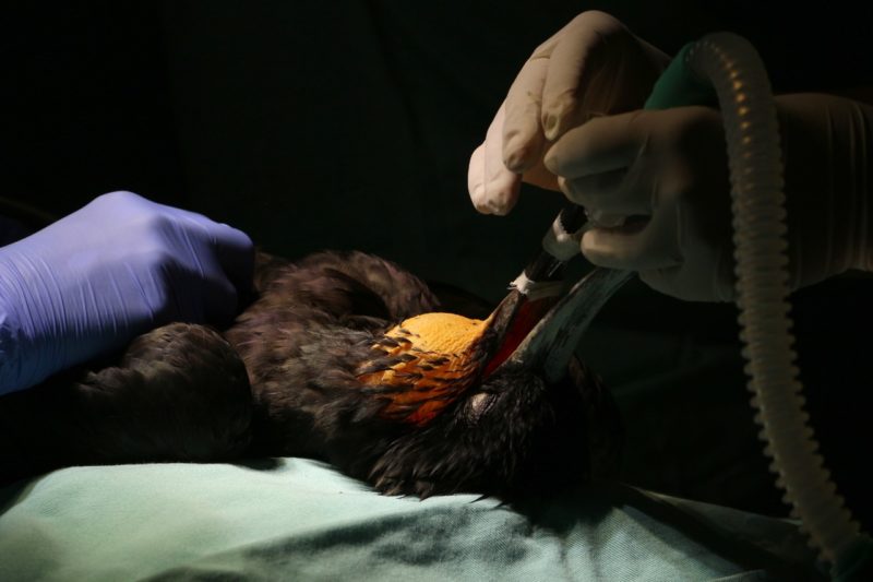 Antes do procedimento, a ave foi anestesiada e passou por uma endoscopia para ajudar no planejamento da extração da haste. De acordo com a avaliação prévia da veterinária Janaina Rocha Lorenço, o objeto estava dentro da cavidade gástrica, com uma ampla área contaminada.