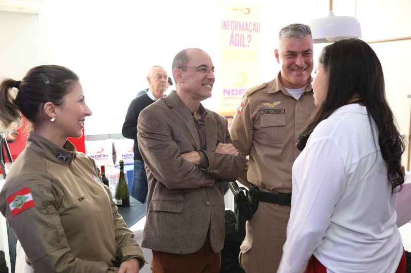 Yhon Tostes (ao centro), diretor do Fórum de Joinville, e o comandante da 5ºCRPM, coronel Márcio Leandro Reisdorfer. – Foto: André Koposh/Divulgação ND - 7 de 41