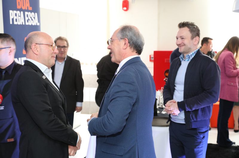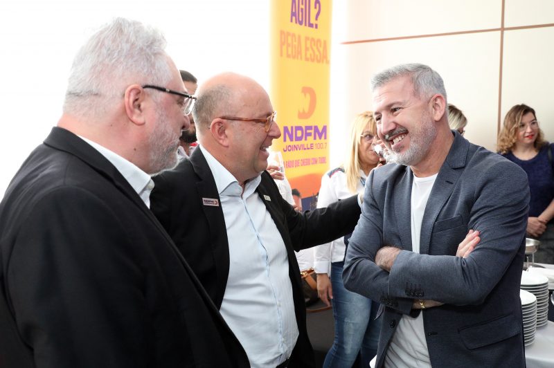 Marcello Petrelli, presidente do Grupo ND, ao centro, cumprimenta Clenilton Carlos Pereira, prefeito de Araquari. Inauguração da Rádio NDFM – Foto: André Koposh/Divulgação ND - 4 de 41