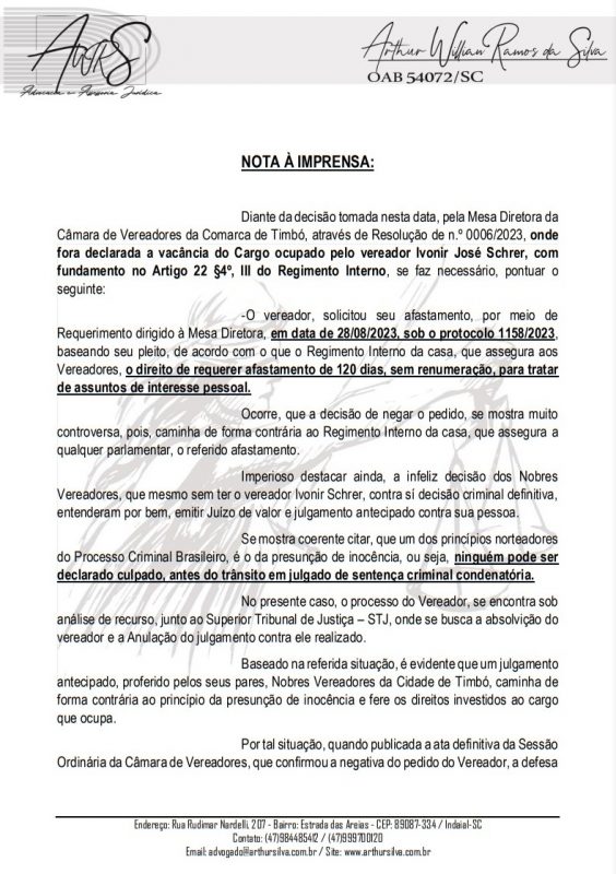 “O presidente da Casa Legislativa, vereador Edson José Bona, na Sessão Plenária de 12 de setembro, terça-feira, declarou a vacância do cargo, nos termos do art. 22, parágrafo 4º inciso III, e parágrafo 5º do Regimento Interno da Câmara Municipal de Timbó e da Resolução da Mesa Diretora nº 06/2023, publicada nesta data de 12 de setembro. Assim, é declarado vago, para todos os efeitos legais e constitucionais, o cargo do vereador Ivonir José Schrer”, diz um trecho da nota da Câmara Municipal de Timbó.