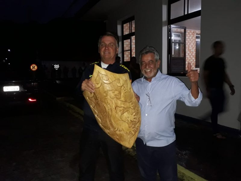 Já na noite de terça-feira (22), Bolsonaro ofereceu mais um jantar. Na ocasião, o futuro prefeito de São Francisco do Sul, Godofredo Gomes Moreira Filho (MDB), presenteou o presidente com um escudo de madeira entalhado – Foto: Divulgação/ND - 20 de 23