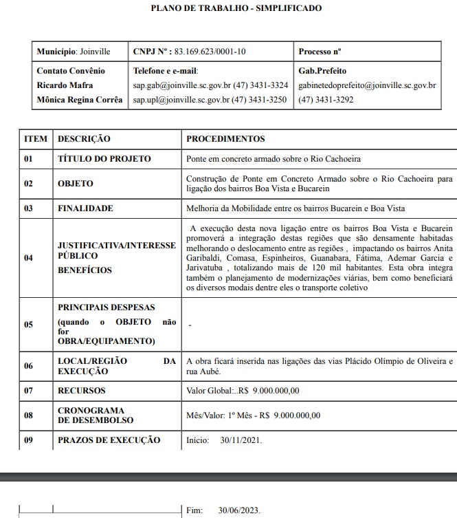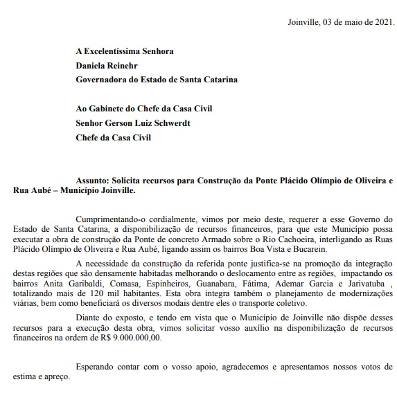 A ponte, inclusive, foi tema de um ofício enviado pela prefeitura de Joinville ao governo do Estado. Confira abaixo o ofício e também o plano de trabalho detalhado sobre a obra da ponte.