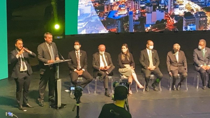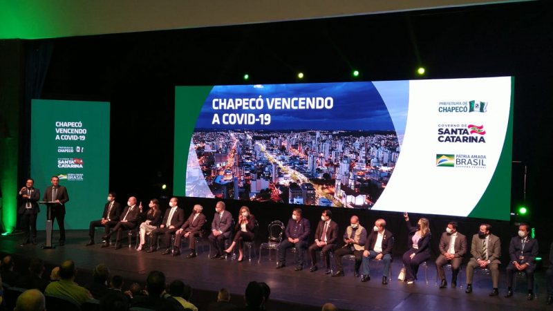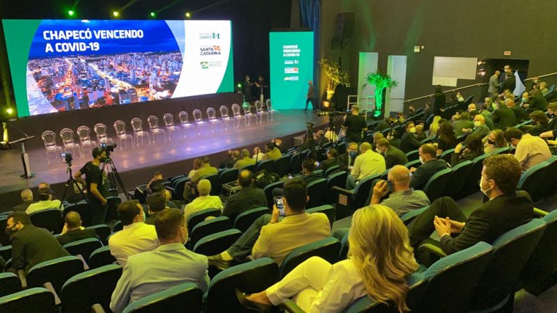 Em um auditório, o presidente em conjunto com outras autoridades políticas, discursaram sobre a melhora de Chapecó, em relação a pandemia. – Foto: William Ricardo/ND
