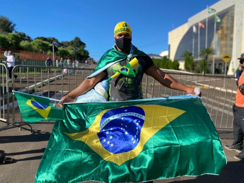 Tiago, de São Paulo. “Eu estou aqui porque gosto dele. Estou trabalhando na cidade e sou apoiador”, disse. O jovem é um dos apoiadores do presidente que se aglomeram na frente do Centro de Eventos. – Foto: William Ricardo/ND
