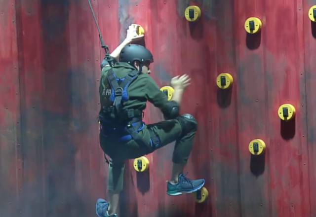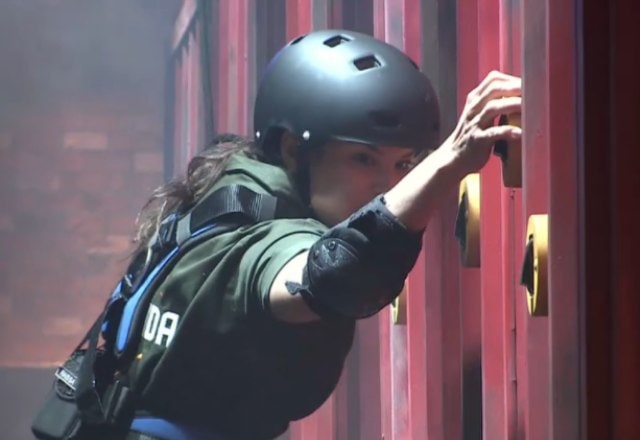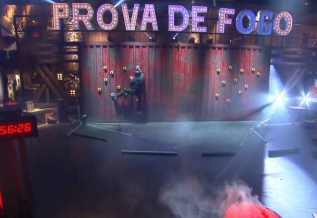 A competição contou, principalmente, com a agilidade dos peões. Içados, eles precisavam pegar impulso para apertar interruptores e acender um letreiro escrito Prova de Fogo – Foto: Reprodução/PlayPlus - 4 de 7