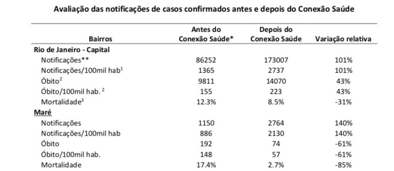 De julho do passado até agora, a redução na mortalidade na Maré foi de 85,5%, como revela a tabela abaixo. É possível notar também que mais do que dobrou o número de notificações.