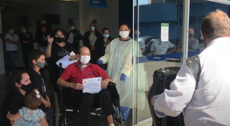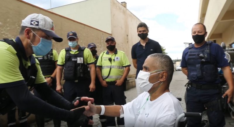 Gilson Lucas, 51 anos, ficou 111 dias internado por conta da doença. No dia 26 de novembro recebeu alta do hospital São José e foi homenageado por colegas de trabalho e profissionais da saúde. Gilson, que é agente de trânsito, ficou quase dois meses na UTI. “Eu agradeço, primeiro, a Deus porque agora eu tenho uma nova vida. Ele me deu uma chance para voltar ao convívio de vocês, disse. – Foto: Reprodução vídeo/Divulgação ND
