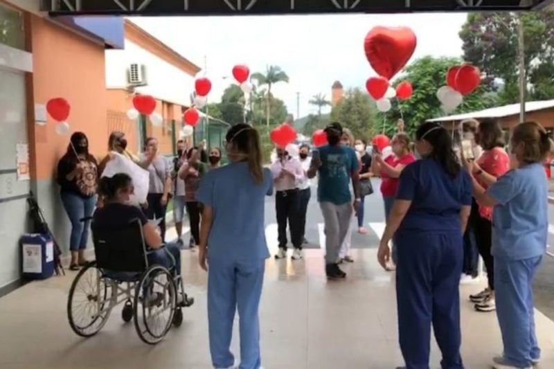 Após ficar 66 dias internada, Adoralice Lopes Costa ganhou alta do Hospital Bethesda, onde ela trabalha, em maio. A maioria dos dias ela passou na UTI, foram 44. Na saída foi homenageada pelos colegas. “Eu me senti em casa, à vontade. A gente tem medo, chora, mas só tenho que agradecer”, disse Dora- Foto: Hospital Bethesda/Divulgação