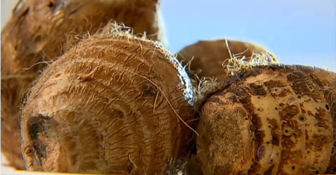 O inhame é uma boa fonte de vitamina A, B1, B2, B3, B5, B6 e C, fibras, potássio, manganês e vitaminas do complexo B, ferro, magnésio, fósforo, potássio, cobre e manganês. Ajuda a melhorar a saúde digestiva; auxilia na perda de peso; diminui o nível de colesterol e glicêmico; possui propriedades anticancerígenas; fortalece a função cerebral; alivia inflamação e sintomas da menopausa; promove a fertilidade; ajuda a manter o coração saudável; previne anemia e pode melhorar a visão. Adriana faz apenas um alerta: não pode ser consumido cru pois apresenta substâncias tóxicas. – Foto: Reprodução/Record TV - 8 de 11
