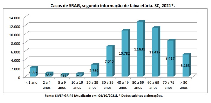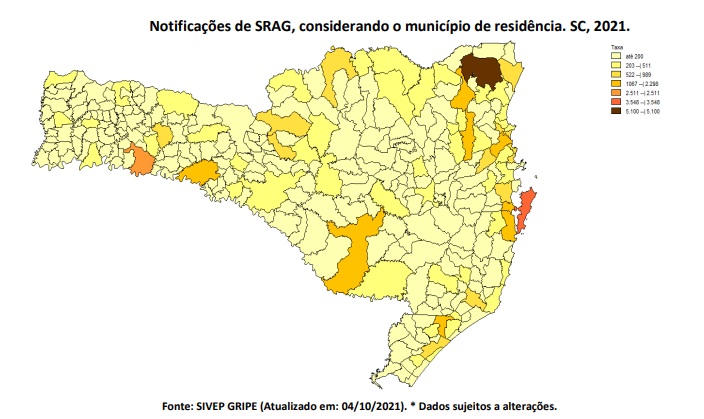 A Dive/SC (Diretoria de Vigilância Epidemiológica de Santa Catarina) divulgou nesta quarta-feira (6) os dados de Síndrome Respiratória Aguda Grave no Estado. O recorte abrange o período entre 3 de janeiro a 2 de outubro de 2021.