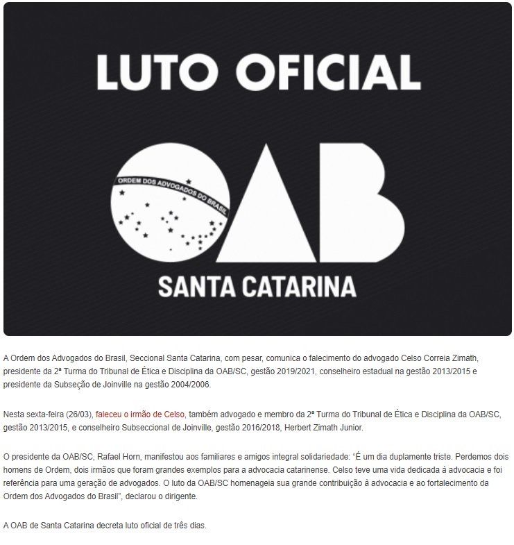 No fim da tarde desta sexta-feira, a OAB de Santa Catarina decretou luto oficial de três dias e lamentou as mortes dos advogados Herbert e Celso Zimath.