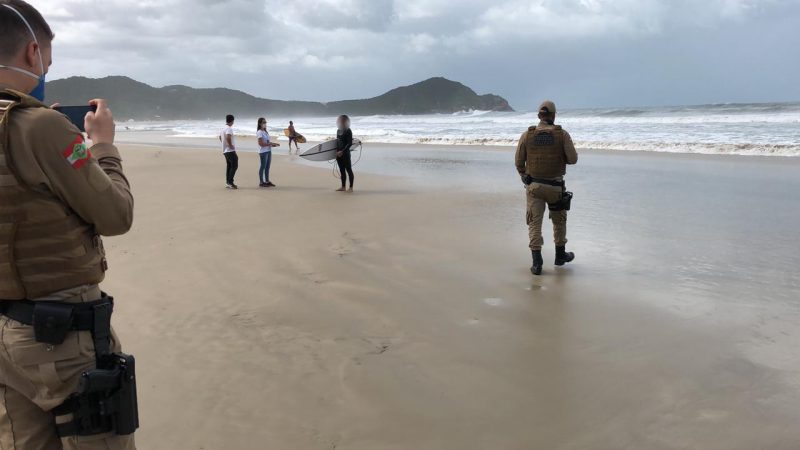 Em Imbituba a Polícia Militar auxiliou no trabalho de fiscalização das medidas implantadas na cidade. A permanência na praia está proibida sob qualquer hipótese. Em algumas praias, os surfistas, novamente, foram orientandos a deixar o local. – Foto: Prefeitura de Imbituba/divulgação