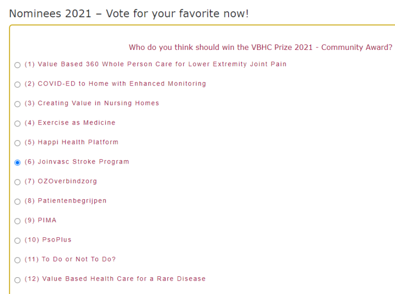 Até as 20h desta terça-feira (18/5), o público pode votar pela internet e ajudar o Joinvasc, programa público de tratamento de Acidente Vascular Cerebral (AVC) de Joinville, a ser premiado como a melhor iniciativa mundial em valor em saúde.