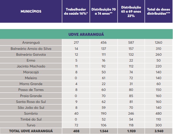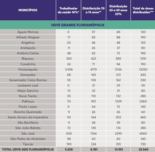 SeguirMetade das 86.400 doses da vacina Sinovac/Butantan recebidas no dia 10 de março também serão distribuídas para os municípios catarinenses para a aplicação da dose 2. Metade (43.200) já havia sido enviada nos dias 10 e 11 de março para aplicação da dose 1.