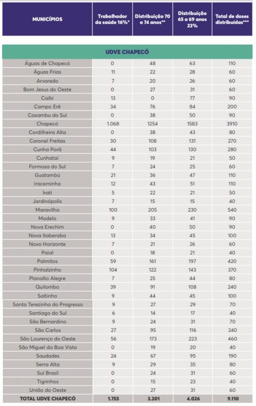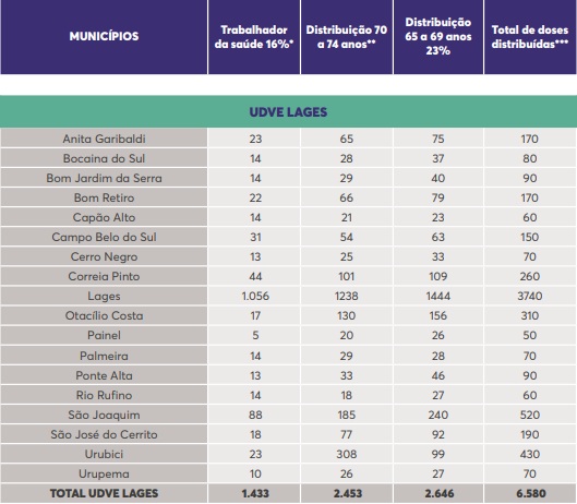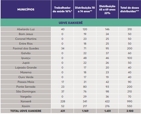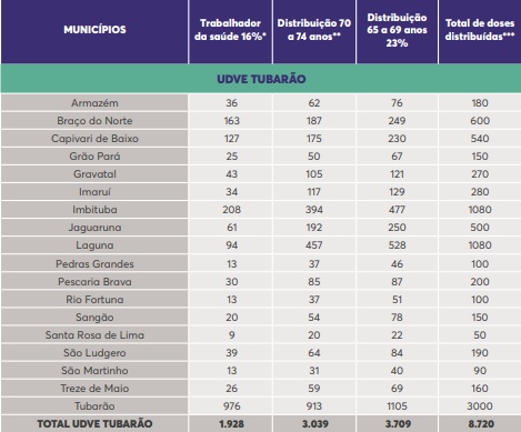 As doses servirão para dar continuidade à vacinação dos trabalhadores da saúde e dos idosos com idade entre 70 e 74 anos, e iniciar a vacinação dos idosos com idade entre 65 e 69 anos.