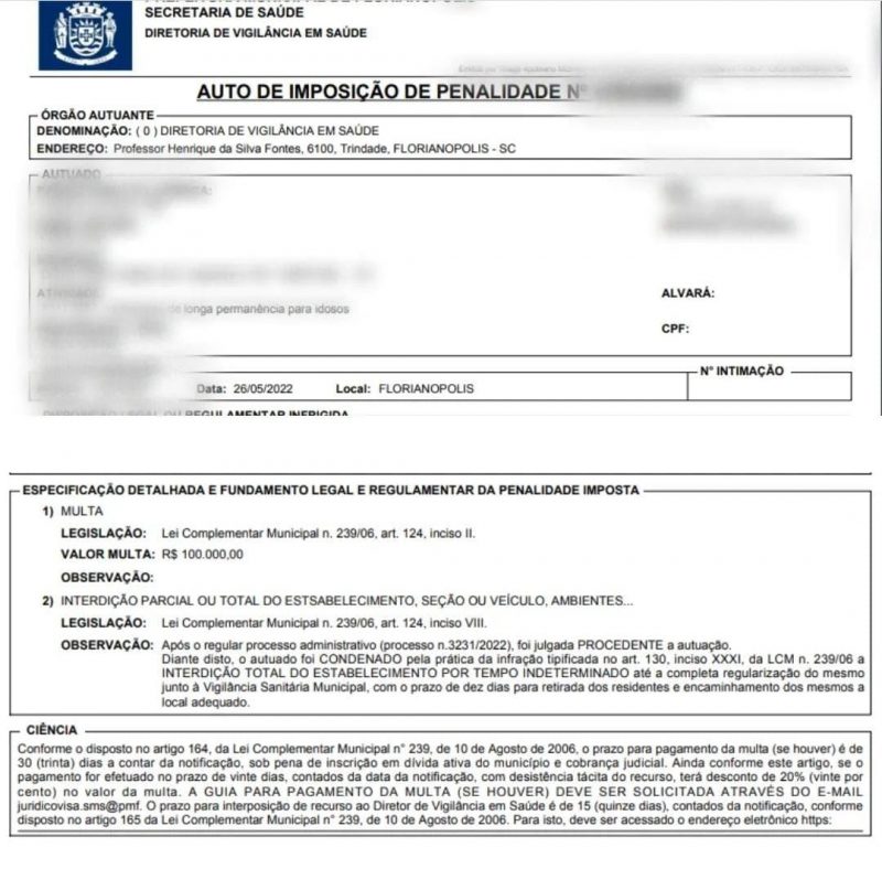 A VISA (Vigilância Sanitária de Florianópolis) multou em R$ 100 mil uma Instituição de Longa Permanência (asilo) na região continental da cidade. De acordo com a pasta, o local também está interditado por tempo indeterminado.