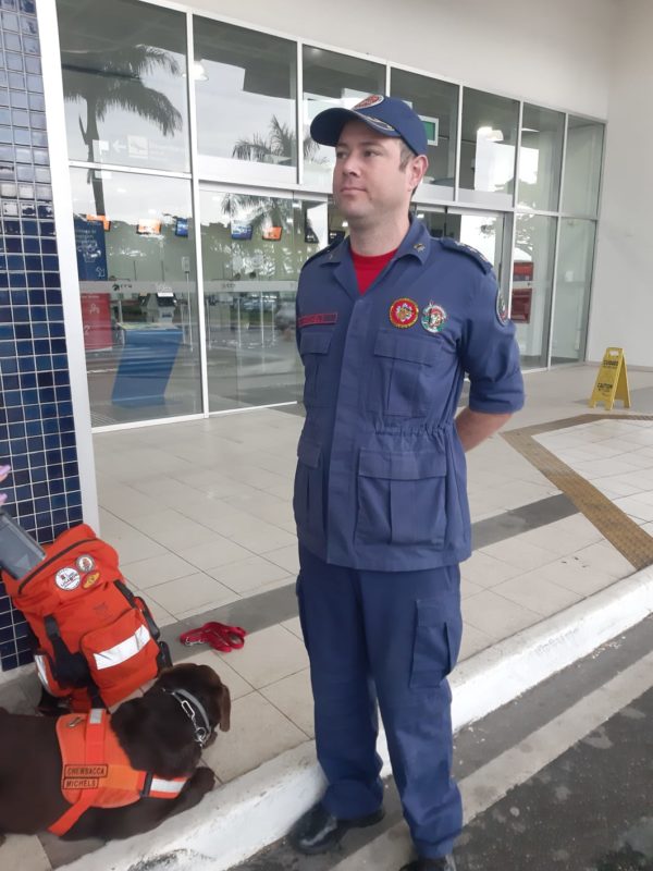 O cão Chewbacca ficou agitado na manhã desta terça-feira (31) assim que viu o major Clemente Stähelin Michels vestindo a farda. A dupla de Joinville, no Norte de Santa Catarina, embarcou para Pernambuco, onde vai ajudar nas buscas aos desaparecidos por causa das chuvas que atingiram o Estado nos últimos dias.